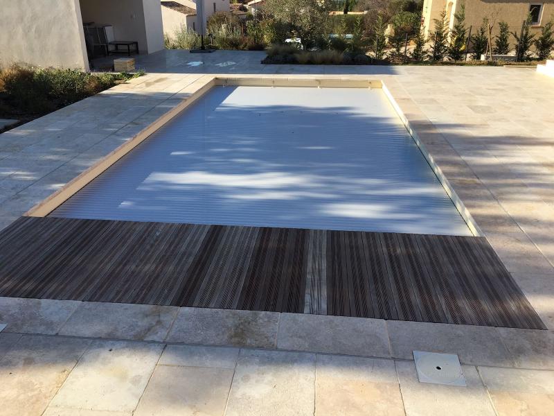 Volet lames grises , poutre métallique peinte et caillebotis bois IPE ( Marin Dubuard) Pourrières